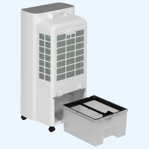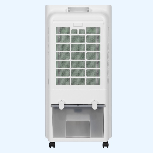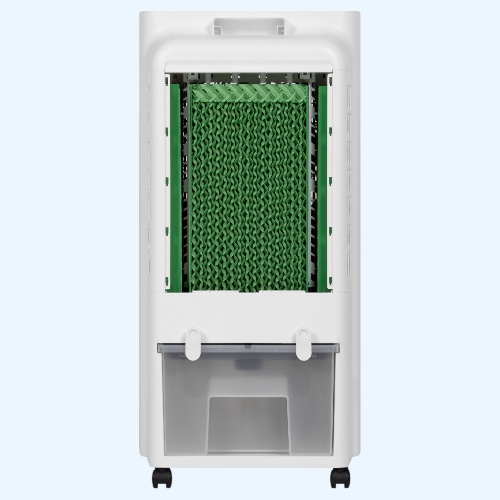 - Прибор работает без фреона по принципу испарительного охлаждения – вода из бака с помощью помпы распыляется на целлюлозный ячеистый фильтр