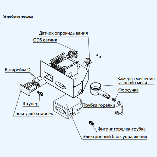 - Оснащен функцией отключения подачи газа при наклоне прибора более, чем на 45 °С, так же при угасании пламени.