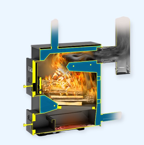 - Глубокая наклонная топка для использования длинных дров и равномерного распределения угля по всей глубине топки при засыпке.